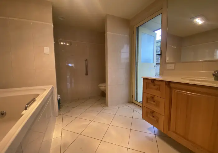 The main bedroom is thoughtfully designed with air-conditioning, a walk-through robe and a two-way bathroom complete with bathtub.