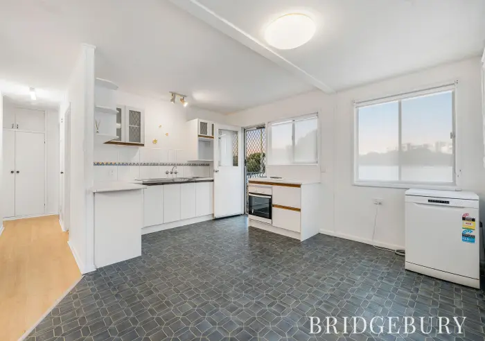 The spacious kitchen is equipped with electric cooking and offers direct access down to the backyard, making outdoor dining and entertaining effortless.