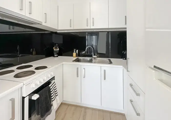 A full-sized kitchen offers ample storage and workspace, ideal for everyday living and entertaining.