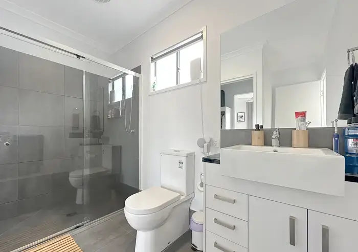 The ensuite is thoughtfully designed and includes a shower and toilet for added convenience.