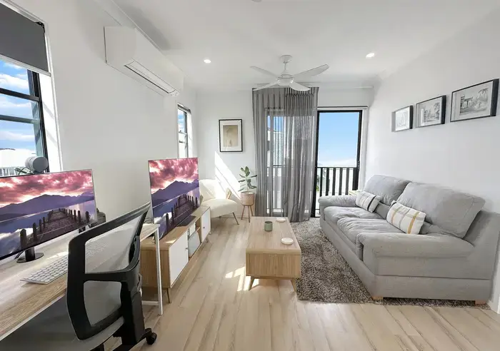 The light-filled living area is equipped with air conditioning and ceiling fans to ensure year-round comfort.