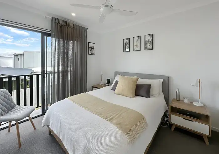 The property features a spacious bedroom complete with a private balcony, walk-in robe, and ceiling fan, providing a comfortable and functional retreat.