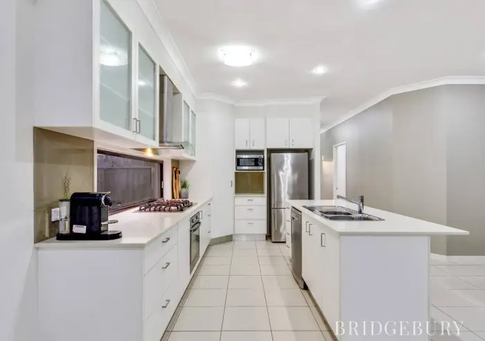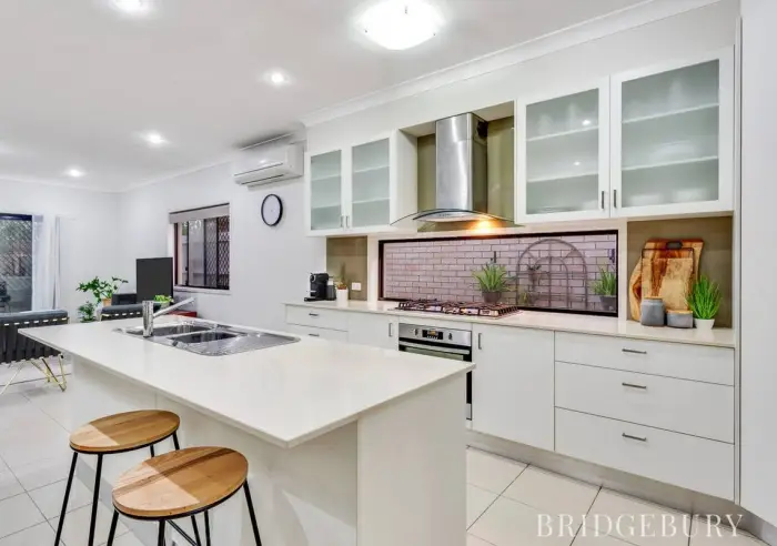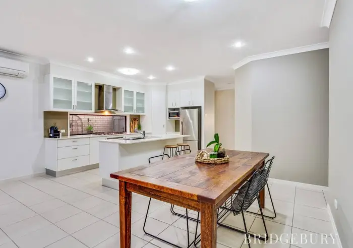 The modern and spacious Air-Conditioned open plan living feels great and offers generous space for the growing family for dining and living. The chef of the household will be excited to find plenty of stone benchtop space which along with quality appliances, oodles of cupboard space, island bench and full-length window splash-back makes for an incredible creative space to be proud of whilst whipping up culinary delights.