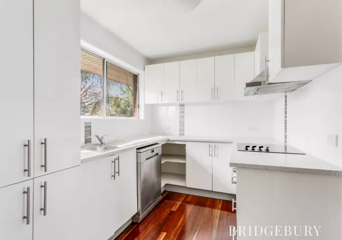 The central kitchen is neat and functional, with plenty of storage and bench space, overlooking the rear yard.