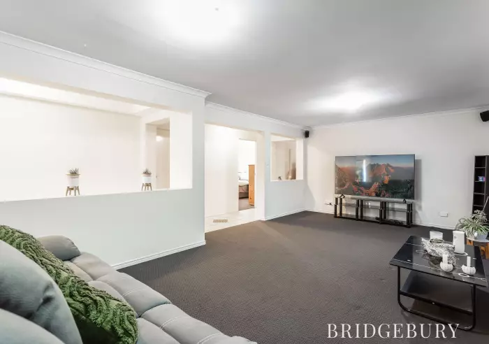 Children have their own dedicated retreat, cleverly positioned alongside three additional bedrooms and separate from the master suite, offering both privacy and a practical solution for keeping toys and play areas contained. The master bedroom, located in the middle of the home, features a walk-in robe, en-suite, and split-system air conditioning. A second split-system unit ensures the main living zone remains comfortable in all seasons.
