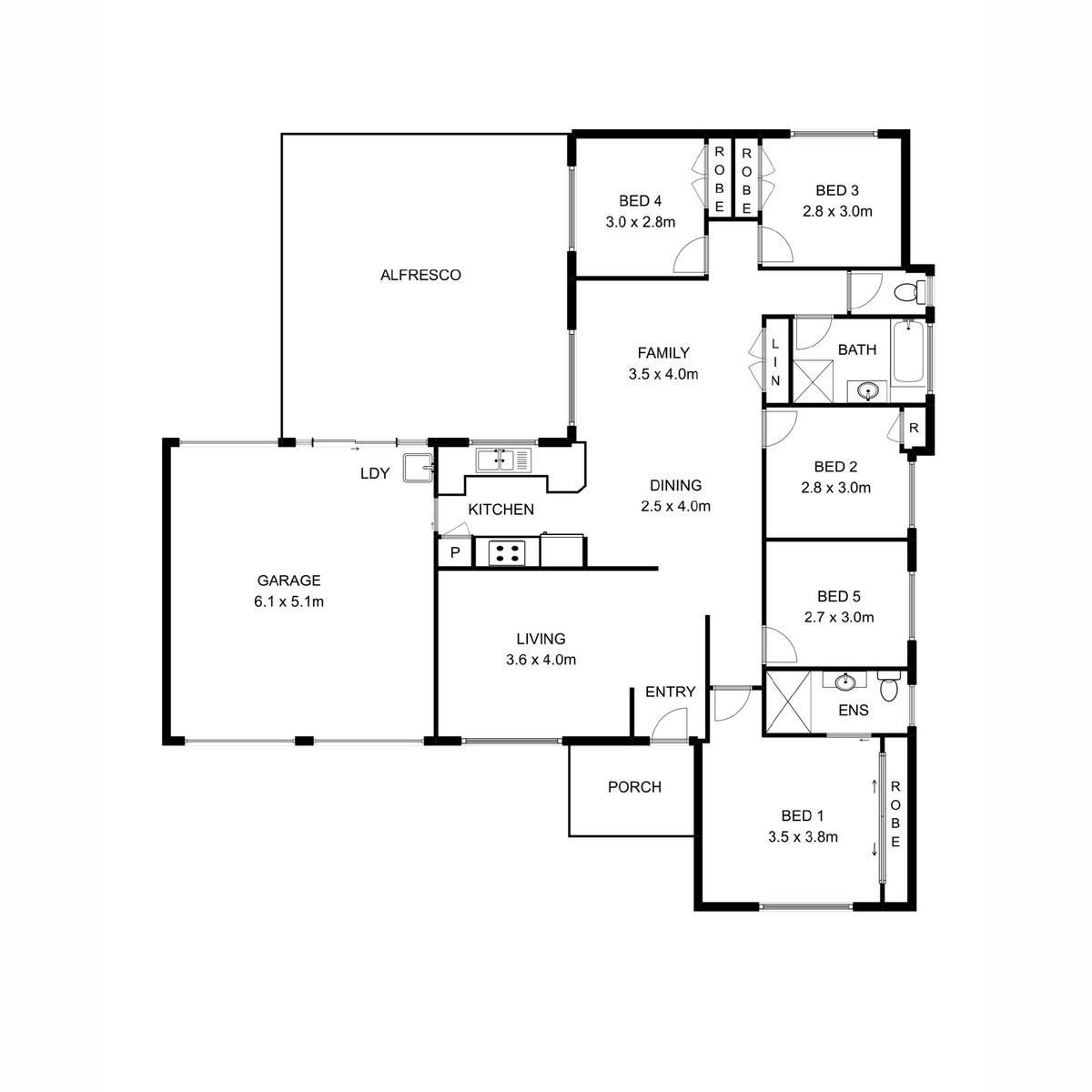 The main bedroom includes its own ensuite and walk-in robe, providing a private retreat for parents, while the remaining four bedrooms all feature built-in wardrobes and ceiling fans. A central bathroom with a separate bath and shower services the home, ensuring practicality for families.