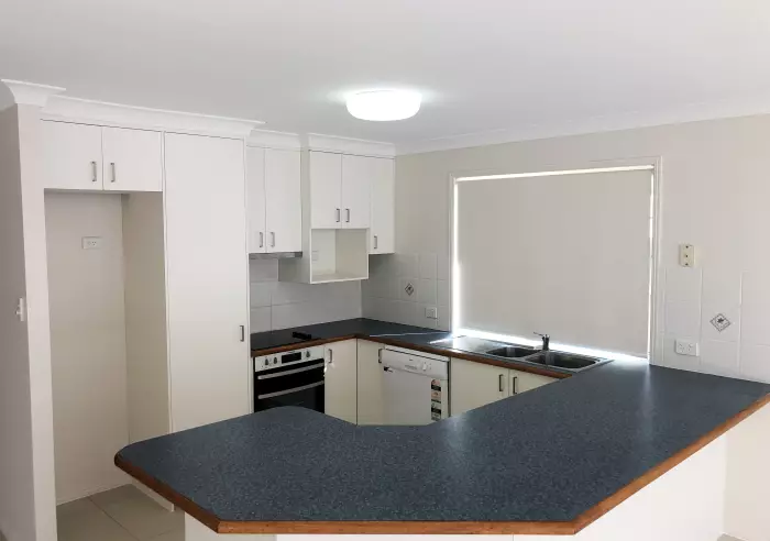 The open-plan kitchen boasts generous bench space, a dishwasher, and ample storage, flowing seamlessly into the light-filled living and dining areas.