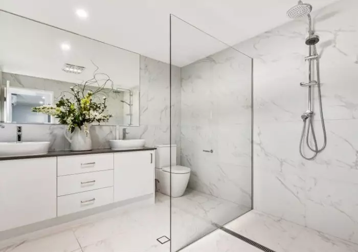 Both the ensuite and bathroom showcase floor-to-ceiling tiles and double vanities.